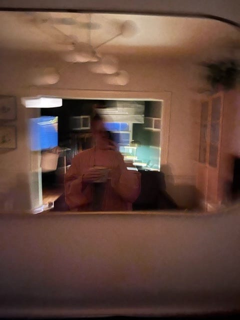 For now, I have learned that a candle and coffee is quite nice in the living room. In this room, amber shadows dance off the tall ceiling, and if it’s raining, I can open a window to listen. After her morning run though the yard, Heidi settles on the rug at my feet. One or more cats come to make themselves warm on my lap.
